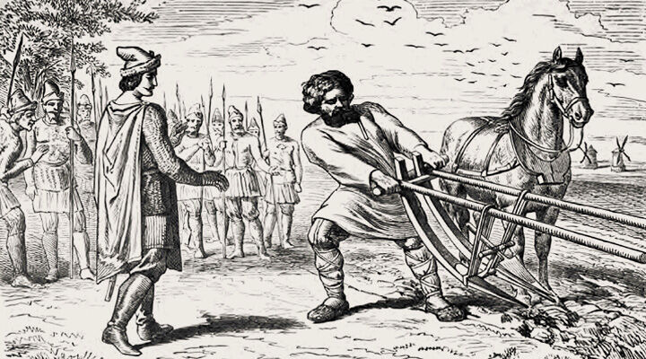 Вольга видит, что пахарь может пригодиться ему, когда придется взимать с горожан дань, и приглашает его ехать вместе с ним. Они садятся на коней и едут, но пахарь вспоминает, что забыл выдернуть соху из земли и бросить ее за ракитовый куст. Вольга посылает пятерых могучих молодцов, но те не могут справиться с задачей. Тогда Вольга посылает еще десяток молодцов, но и тем не удается выдернуть соху из земли. Наконец, вся дружина Вольги пытается выдернуть соху. Тогда подъезжает к своей сохе пахарь, берет ее одной рукой, вытаскивает из земли и бросает за ракитовый куст. Вольга хочет знать, как имя могучего пахаря. Тот отвечает, что зовут его Микула Селянинович.