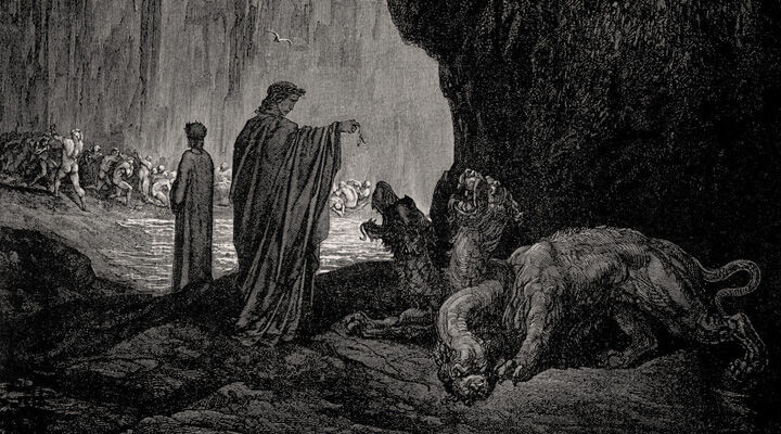 В круге третьем свирепствует звероподобный пёс Цербер. Залаял было на нас, но Вергилий усмирил и его. Здесь валяются в грязи, под тяжёлым ливнем, души грешивших обжорством. Среди них мой земляк, флорентиец Чакко. Мы разговорились о судьбах родного города. Чакко попросил меня напомнить о нем живым людям, когда вернусь на землю.