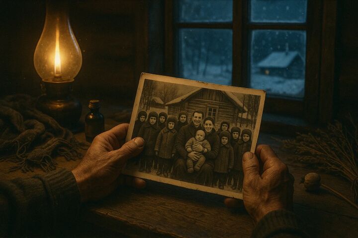 Рассказчик смотрит на школьную фотографию и вспоминает о друге детства, бабушке, родной избе, раскулачивании, деревенском быте и семье молодых учителей, которые организовали школу в его глухом селе.