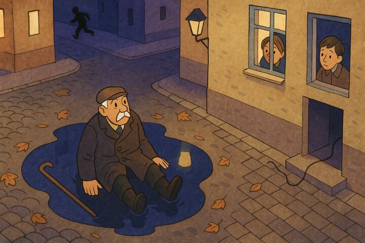 Придя домой после школы, Настенька увидела, что кипящий чайник залил водой пол, а её дедушка спит, завернувшись в одеяло.