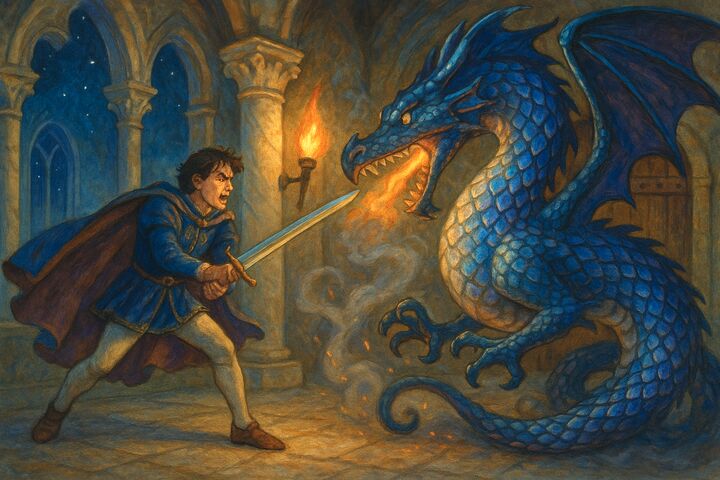 Ночью по подземному ходу Дженнаро с мечом в руках пробирается к брачному покою короля и становится на стражу, исполненный решимости спасти брата от страшной смерти в пасти дракона. Чудовище не заставляет себя ждать, и принц вступает с ним в смертный бой. Но, увы! С ног до хвоста дракон покрыт алмазной и порфирной чешуёй, против которой бессилен меч.