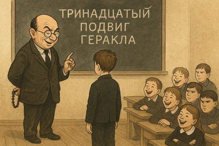 Медсестра и доктор ушли — до конца урока осталось немного времени. В таких случаях учитель рассказывал «что-нибудь поучительное и древнегреческое». Задумчиво перебирая чётки, Харлампий Диогенович рассказал классу о двенадцати подвигах Геракла и сообщил, что сейчас был совершён тринадцатый. Но Геракл совершал свои подвиги из храбрости, а этот был совершён из трусости.