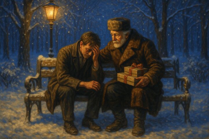 К скамейке подошёл незнакомец — невысокий старик в тёплой одежде — и попросил разрешения присесть. Мерцалов молча подвинулся. Несколько минут они сидели в тишине, а затем старик заговорил о морозной ночи и о том, что купил подарки знакомым ребятишкам.