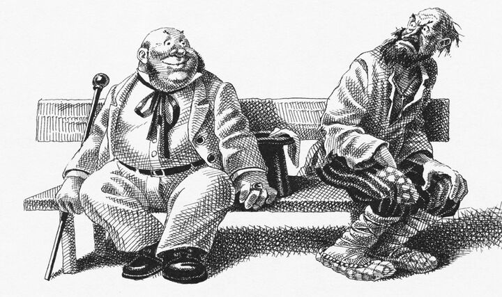 В одном селе жили два соседа — Иван Богатый и Иван Бедный. Иван Богатый был филантропом, ценностей не производил, но размышлял о справедливом распределении богатств. Ивану Бедному думать о распределении богатств было некогда, вместо этого он производил ценности.