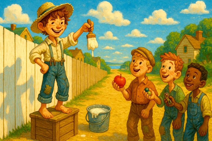 Том притворился, что побелка забора — самое интересное занятие в мире. Знакомые мальчишки купились на это и начали обменивать свои «сокровища» на возможность побелить.